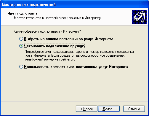 Выбиерите Установить подключение вручную и нажмите Далее