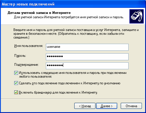 В поля Имя пользователя и Пароль вводите логин* и пароль для входа в Интернет соответственно, и нажимайте Далее